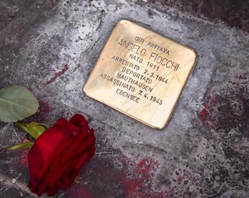 A small square block of stone (10x10 cm), covered with shiny brass, placed in front of the door of the house in which a deported to the Nazi concentration camps and extermination camps had his last residence.