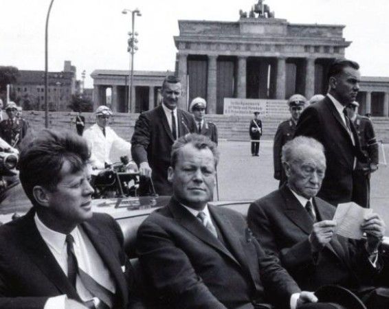 É il 26 giugno 1962, (il secondo del Muro) quando il presidente degli Stati Uniti tiene davanti al municipio di Schöneberg un discorso rimasto celebre. anche per il seguito della frittella. [nella foto di Stefan Moses da sinistra, il presidente Adenauer e il sindaco di Berlino Willy Brandt]